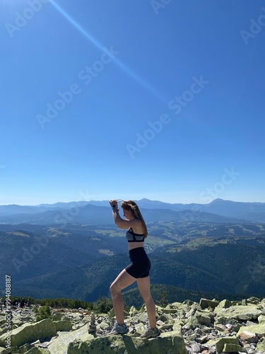 © galyna0404, Naklejka premium woman on the top of mountain