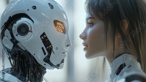 Fototapeta premium Woman opposite AI. The concept of the confrontation between humanity and artificial intelligenc