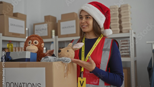 © Krakenimages.com, Obraz premium Woman organizing donations at charity center wearing santa hat sorting toys in festive indoor setting enhancing volunteer spirit and holiday joy helping community with generous contributions.