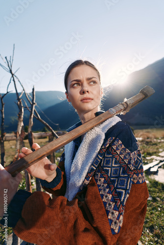 Naklejka premium Woman outdoors in mountains holding a wooden staff across her shoulders, rural portrait at sunrise with patterned jacket and meadow valley background, thoughtful gaze in warm sunlight.