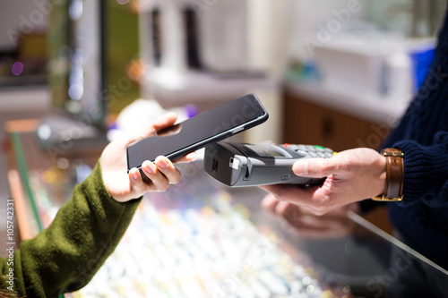 Obraz premium Woman paying with NFC technology on smart phone at shop