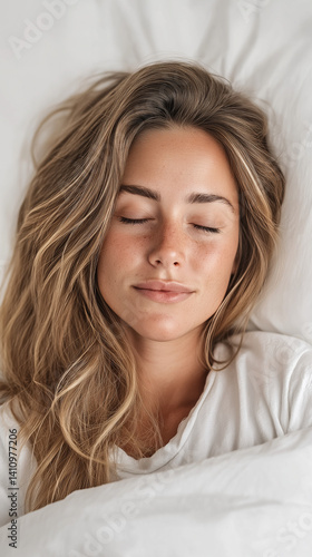 Fototapeta premium Woman peacefully sleeping on soft bed sheets