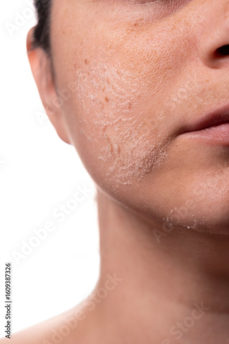 Obraz premium Woman peeling facial skin – Skincare treatment concept – Female face with flaky skin after exfoliation