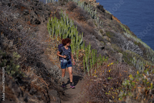 © Xalanx, Fototapeta premium Woman photographer hiking Anaga coast
