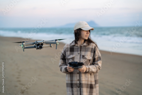 © Bohdan, Obraz premium Woman photographer landing or taking off a drone on seaside