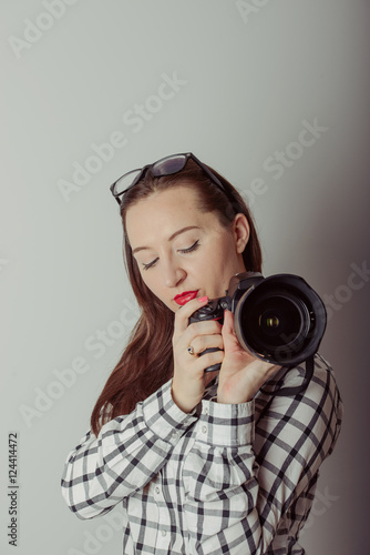 Fototapeta premium Woman-photographer takes images,