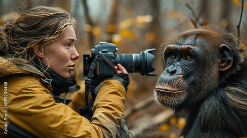 © Umi Sakina, Fototapeta premium Woman photographing a chimpanzee in the forest