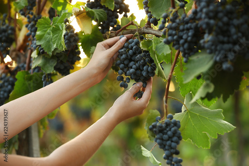 Obraz premium Woman picking fresh ripe juicy grapes in vineyard, closeup