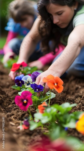 Fototapeta premium Woman planting colorful flowers in a garden.