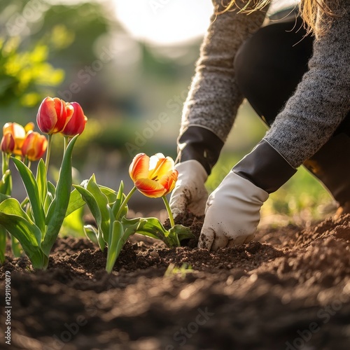 © Suwanna369, Fototapeta premium Woman Planting Red and Yellow Tulips in a Garden