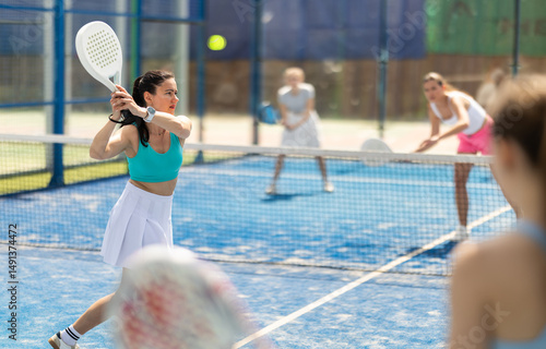 Fototapeta premium Woman playing with other paddle tennis players. Tennis players participate in...
