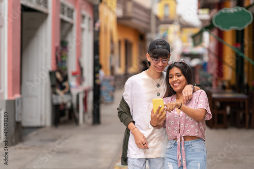 © Guillermo Spelucin, Naklejka premium Woman pointing at the mobile while walking in the street with a friend