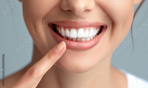 © Denis, Obraz premium Woman pointing finger at beautiful healthy smile, dental proper teeth cleaning concept.