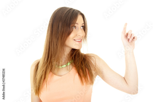 © Smart Future, Fototapeta premium woman points finger at something in her left. Isolated on white
