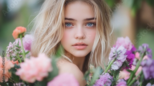 © Endin, Fototapeta premium Woman portrait flowers pastel colors beauty concept