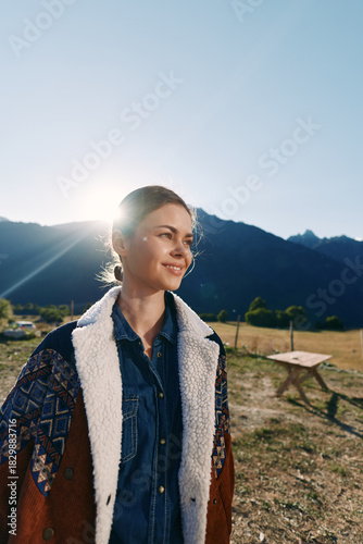 © SHOTPRIME STUDIO, Fototapeta premium Woman portrait in mountains at sunrise with sunlight flare, smile and warm jacket over denim shirt. Outdoors field scene with calm rural landscape and soft backlight.