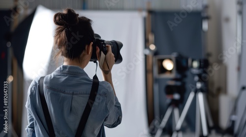 © Wattana, Obraz premium Woman portrait of a professional photographer holding a camera in a studio.