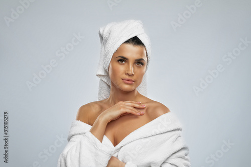 Obraz premium Woman posing in bathrobe after shower.