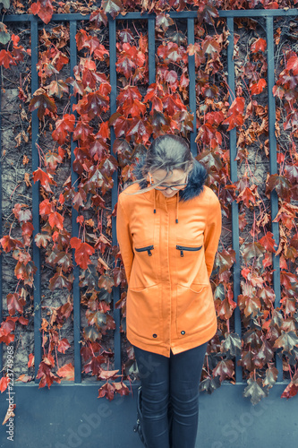 © Henrique, Obraz premium Woman Posing in front of a gate with colorful autumn leaves
