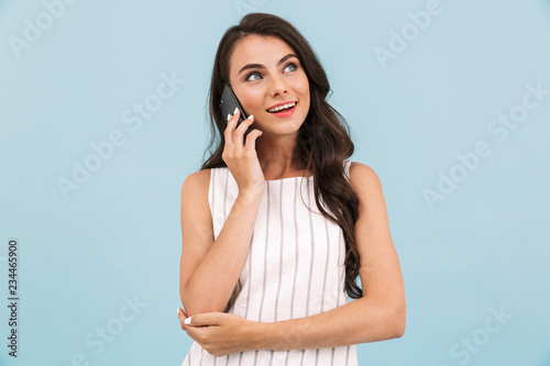 © Drobot Dean, Fototapeta premium Woman posing isolated over blue background wall talking by mobile phone.