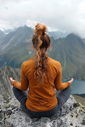 Naklejka premium Woman practices meditation on a mountaintop reflecting mindfulness...