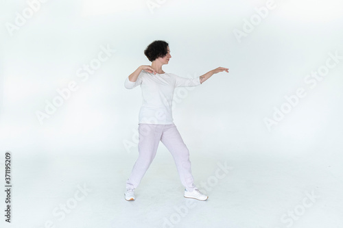 Obraz premium woman practicing qi qong at white studio traditional chinese gymnastics