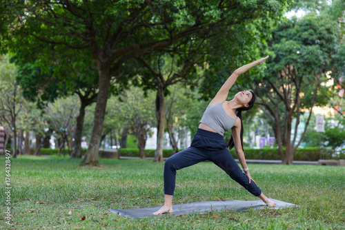 © leungchopan, Fototapeta premium Woman practicing reverse warrior two yoga pose outdoors