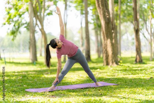 © Kritdanai, Fototapeta premium Woman Practicing Triangle Pose in Nature