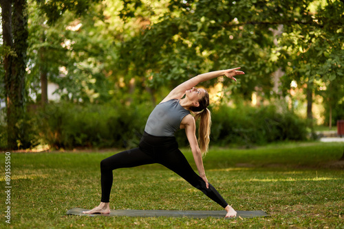 Fototapeta premium Woman practicing yoga in a park on a sunny day