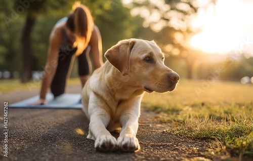 © sasisom, Fototapeta premium Woman Practicing Yoga on a Mat with a Golden Labrador Dog Relaxing in the Park During Sunset