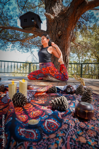 © huseyin, Fototapeta premium Woman practicing yoga pose outdoors on wooden deck under a tree