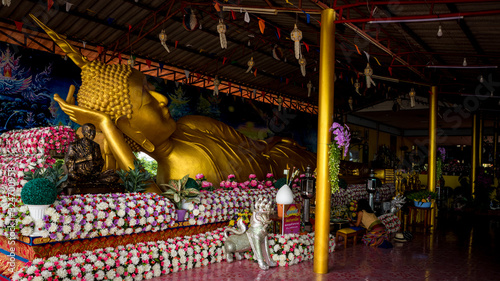 © David, Fototapeta premium Woman praying in wat to reclining Buddha surrounded by flowers