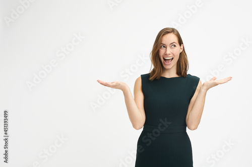 © Martin Villadsen, Fototapeta premium woman presenting a product at both har palms while looking happy and to the right