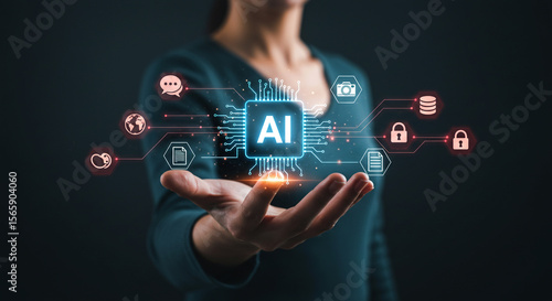 © vecto club, Fototapeta premium Woman Presenting Glowing AI Chip with Connected Icons, Representing Data, Security