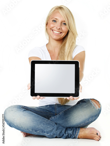 © Karin & Uwe Annas, Naklejka premium Woman presenting her tablet pc with copyspace