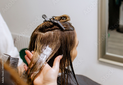 Naklejka premium Woman professional hairdresser doing hair styling to client in beauty salon, applies balm to strengthen hair, stylist doing hair care procedures