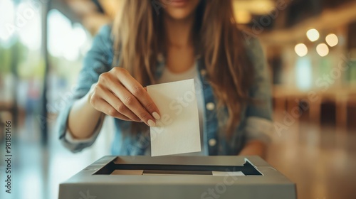 © Piyawat, Fototapeta premium woman putting her ballot in the voting box, focus on hand