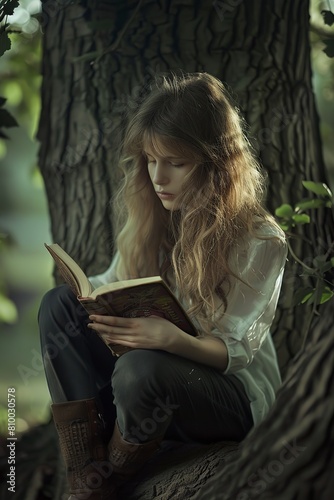 © Jorge Ferreiro, Obraz premium Woman Reading Book Under Tree