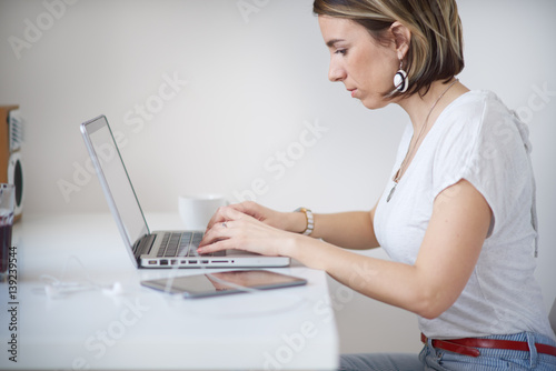 Naklejka premium woman reading / listening music using tablet / laptop at home