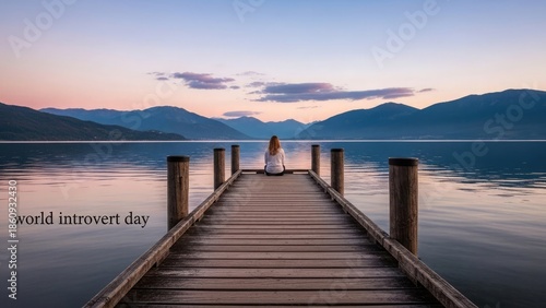 Obraz premium Woman reflects at lakeside dawn