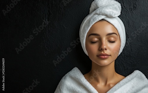 © Svitlana, Obraz premium Woman relax in SPA wrapped in a soft towel. Bright black background. top view