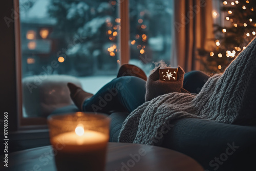 © Kim, Obraz premium woman relaxes on cozy couch by window, enjoying warmth of candle and glow of Christmas lights