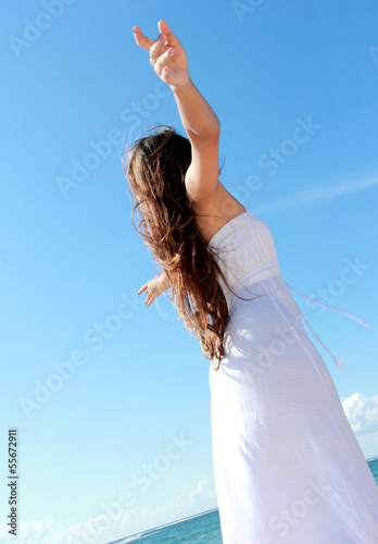 © Odua Images, Naklejka premium Woman relaxing at the beach with arms open enjoying her freedom