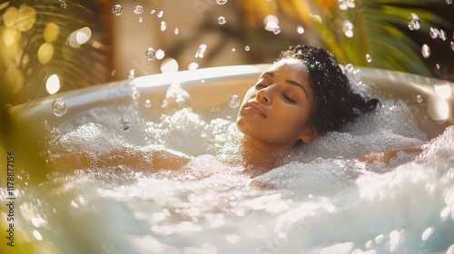 Obraz premium Woman relaxing in a luxurious hot tub, surrounded by warm water and bubbles –...