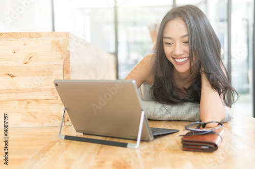 Fototapeta premium woman relaxing lifestyle with laptop computer,playing with laptop on the...