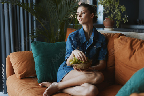 © SHOTPRIME STUDIO, Obraz premium Woman Relaxing on Orange Couch with Basket of Grapes in Front of Her in Cozy Living Room Setting