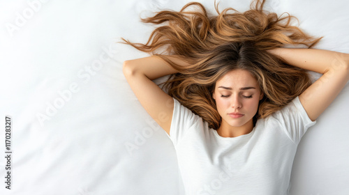 Fototapeta premium Woman Relaxing on White Bed Depicts Tranquility and Rest