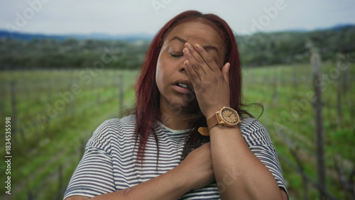 © Krakenimages.com, Obraz premium Woman resting head on hand with eyes closed in forest among vineyard stakes wearing striped shirt; exhaustion.