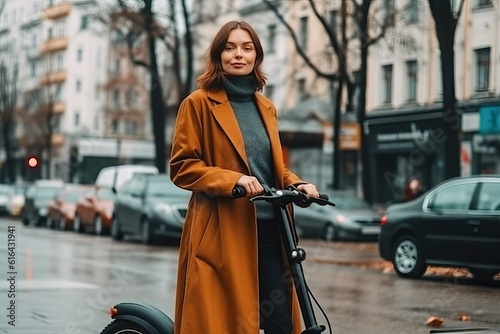 Fototapeta premium Woman riding scooter on street (Ai generated)