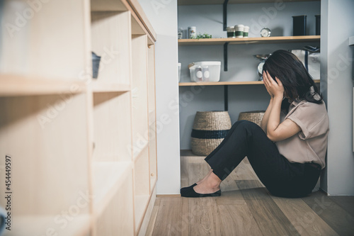 © 健二 中村, Fototapeta premium 暗い部屋で女性が一人床に顔を手で覆っている woman room